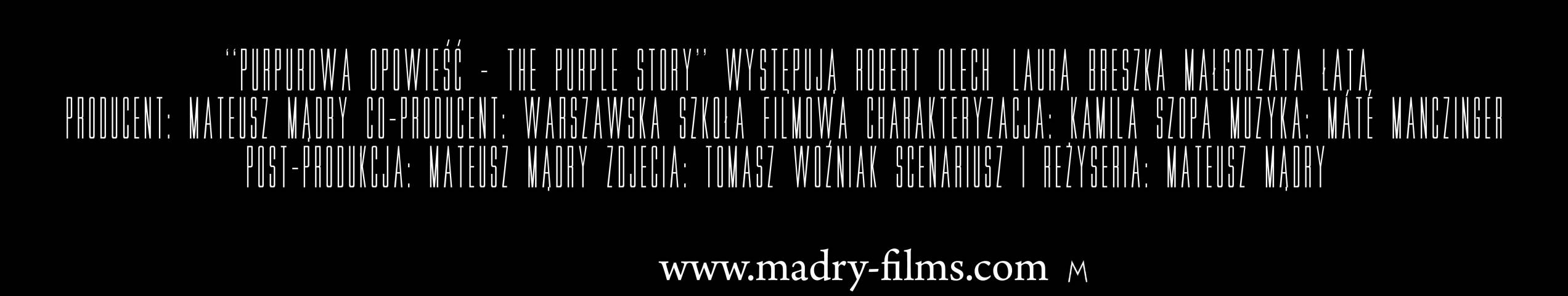 "The Purple Story" ist ein Kurzfilm, der 2011 vom Studenten der Warschauer Filmschule, Mateusz Madry, gedreht und produziert wurde. Ein junger Reporter namens Staszek hilft einem alten Mann, der von einer Bande polnischer Hooligans zusammengeschlagen wurde. Als er nach Hause kommt, scheint sein ganzes Leben auseinanderzubrechen und er gerät in eine Lage, in der er jemanden braucht, der ihm hilft.